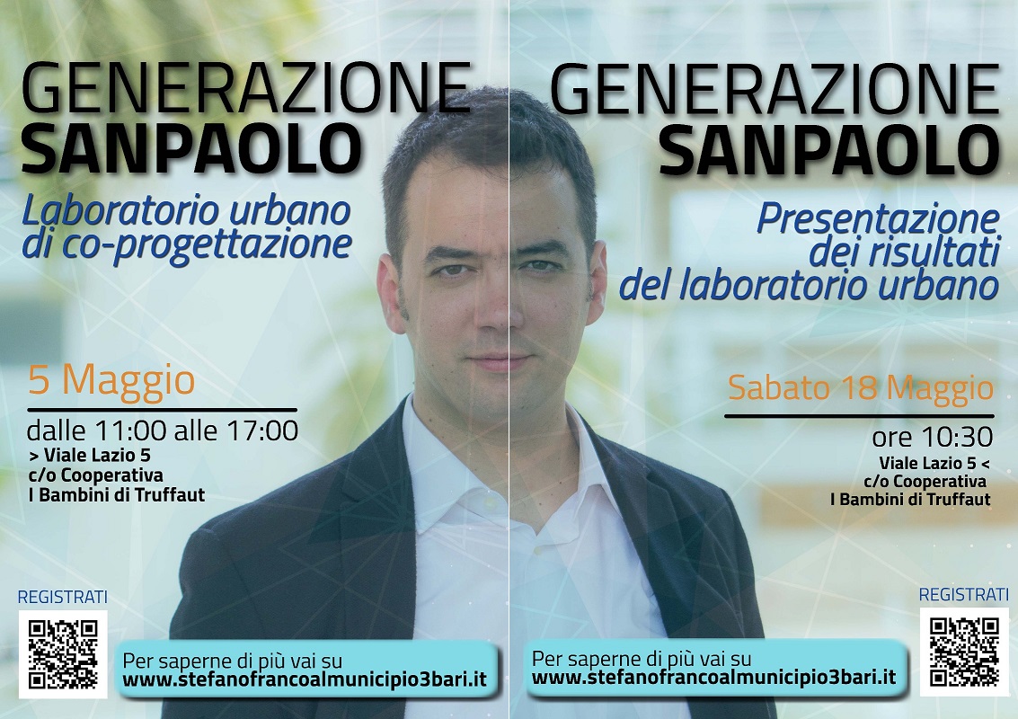GENERAZIONE SAN PAOLO è il più grande progetto di innovazione sociale mai realizzato al Quartiere San Paolo di Bari. L’obiettivo del progetto sarà quello di attivare una serie di iniziative rivolte agli abitanti del Quartiere, dai più giovani fino agli anziani. Generazione San Paolo sarà animata da tutti coloro che vorranno contribuire al miglioramento del luogo in cui vivono, partendo dai giovani e da chi, pur essendo nato e cresciuto al San Paolo, si è realizzato professionalmente e può rappresentare un modello positivo che stimoli gli altri.