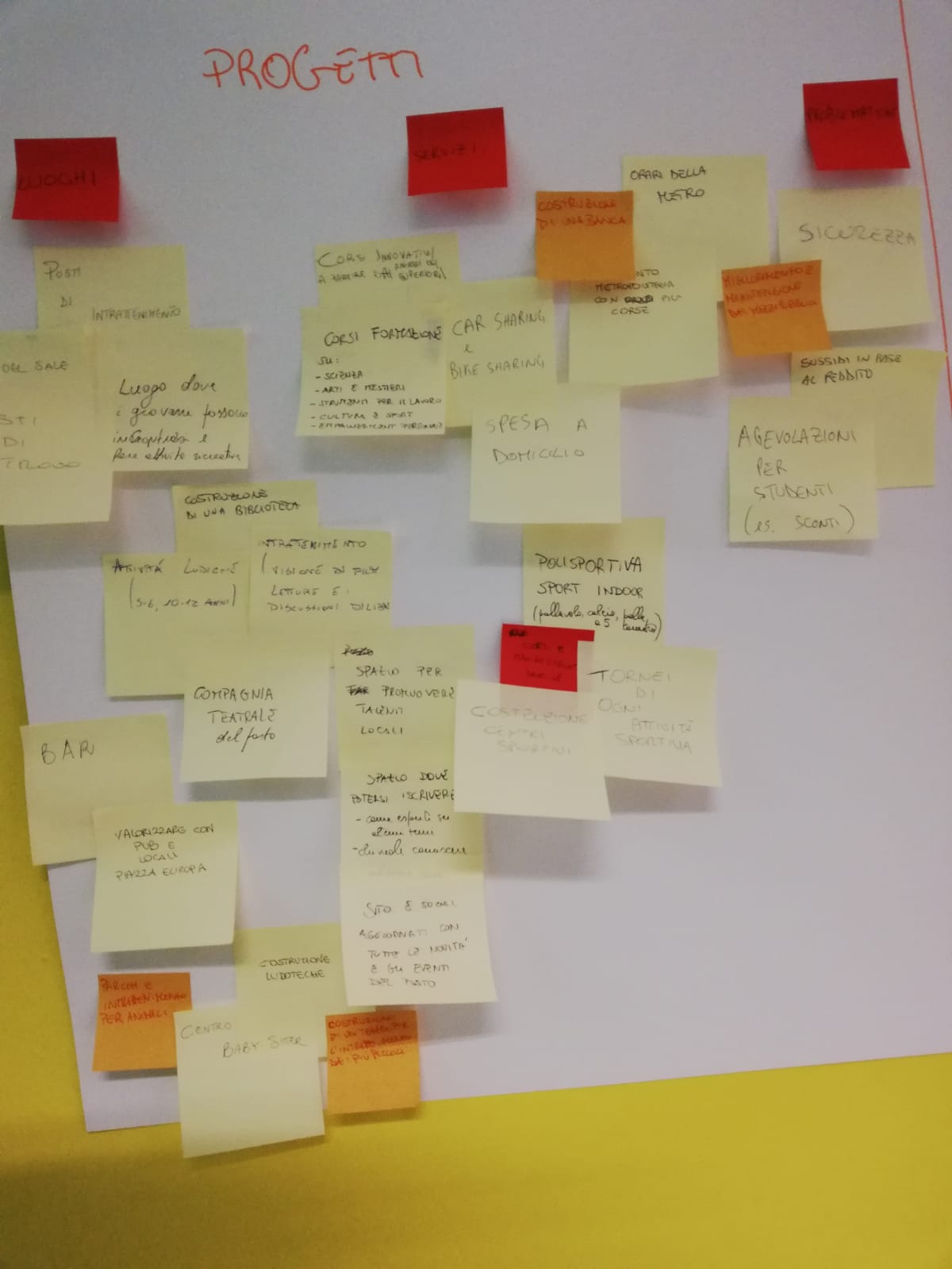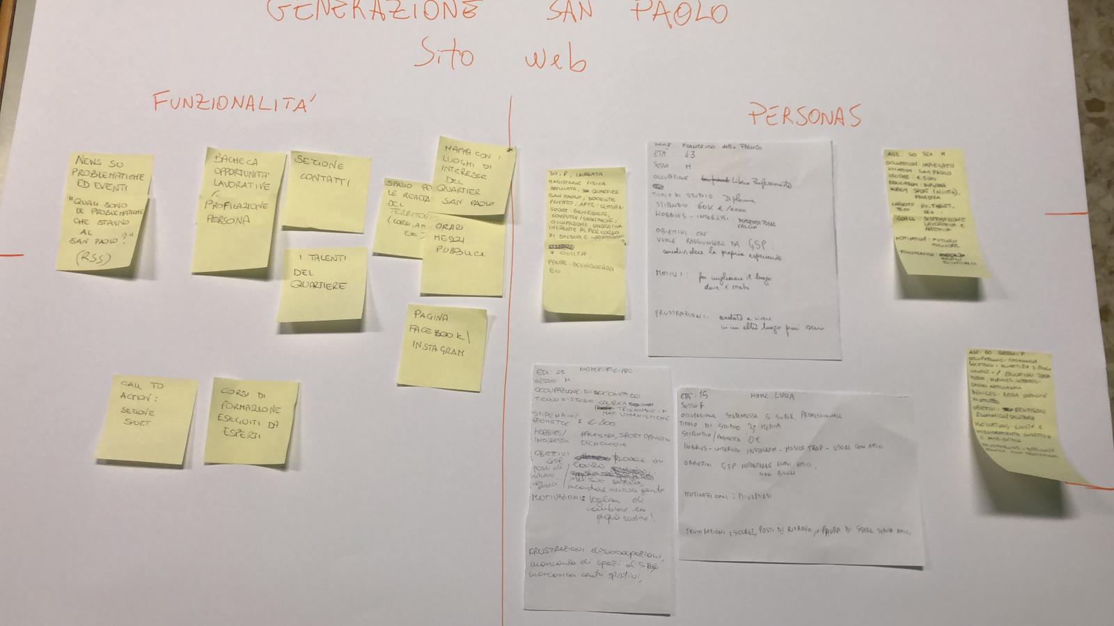 Nella seconda fase ci si è concentrati maggiormente sulle funzionalità del sito web di Generazione San Paolo. Sono state pensate quindi le principali attività che il sito potrà fornire, sulla base dei risultati emersi durante la prima fase dell’incontro. Si è provato anche a pensare a utenti reali che possano utilizzare il sito (le cosiddette personas) in modo da renderlo più funzionale alle esigenze di utenti concreti.